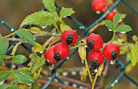 Wer kennt nicht die Hagebuttenbüsche an Straßen- und Waldrändern, die im Herbst ihre leuchtend roten Früchte präsentieren? Die zartrosa Blüten im Frühjahr, auch als Hundsrose oder Wildrose bekannt, locken zahlreiche kleine Insekten und Käferchen an. Wie auch die echten Rosen haben die Hagebuttenbüsche Stacheln (keine Dornen) und wer sich einmal darin verhakt hat, passt beim nächsten Mal bestimmt besser auf.